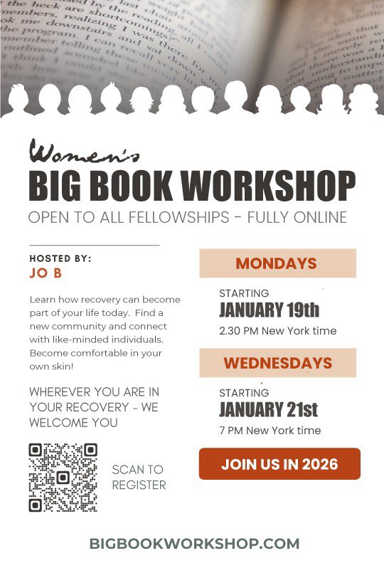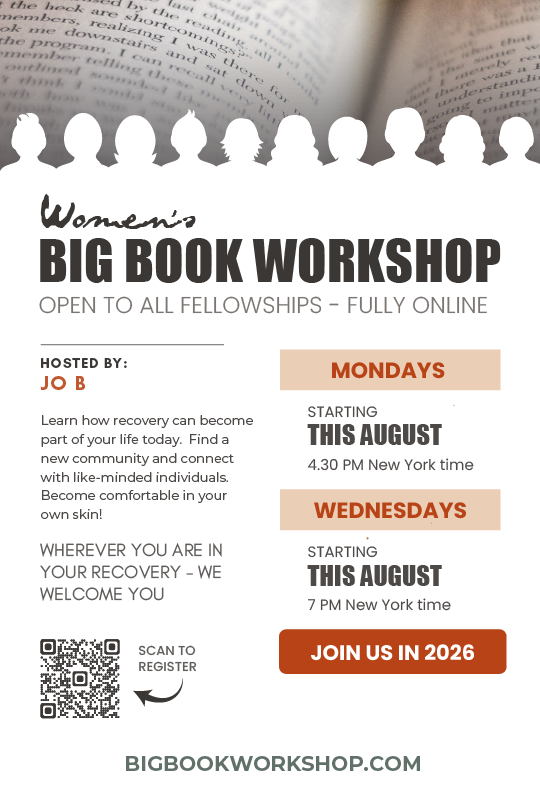 This workshop is not affiliated with any particular Twelve Step fellowship. We study the Big Book and practice how to apply those principles to our lives today. Our material is designed for informational purposes only. Please continue to seek appropriate medical/professional help where you can.
